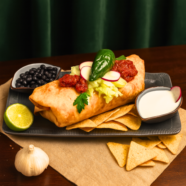 Chimichanga con Salsa de Ajo y Frijoles